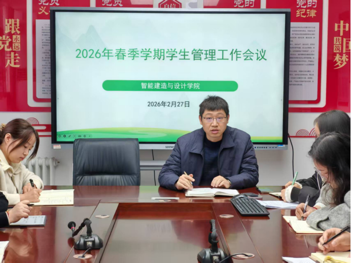 2026年2月27日,智能建造与设计学院召开春季学期第一次学生管理工作会议。党总支副书记张蓄金、学工办主任史真、团总支书记王莹出席会议,全体专兼职辅导员参加会议。会议由张蓄金主持。