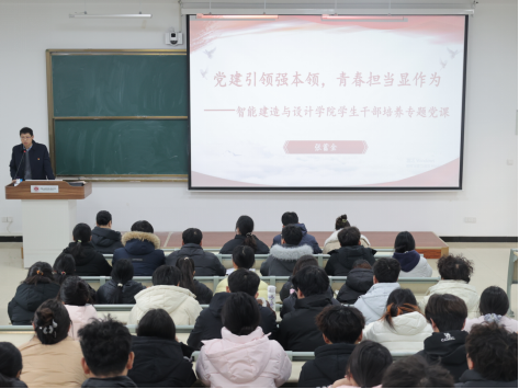 为深入学习贯彻党的创新理论,筑牢学生干部队伍思想根基,锤炼青年担当作为本领,2026年1月7日,智能建造与设计学院党总支副书记张蓄金以“党建引领强本领,青春担当勇作为”为主题为学生干部讲授专题党课,为学院学生干部队伍建设锚定方向、凝聚奋进力量。