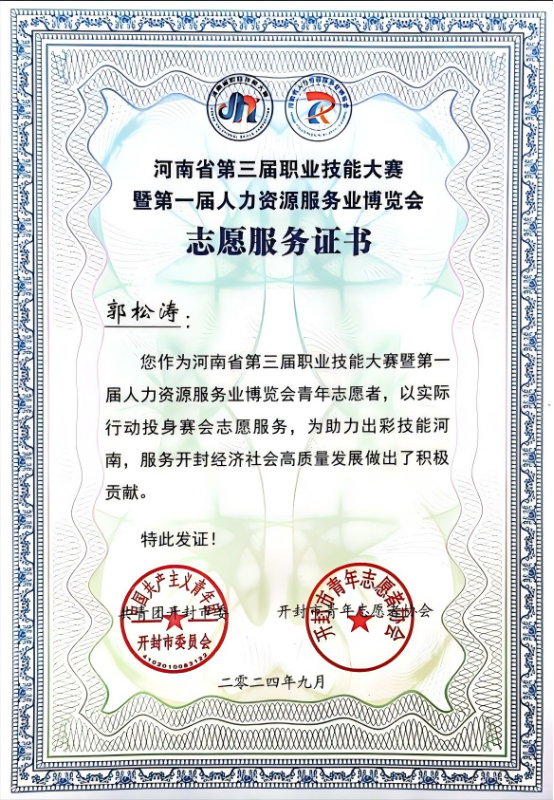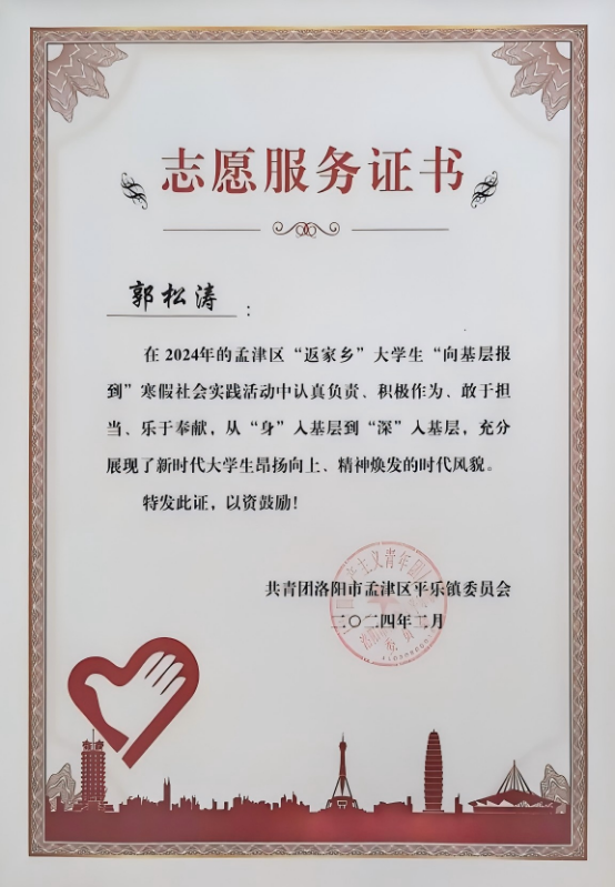 国家资助政策带来的温暖,让他渴望将温暖传递给更多人。他积极投身各类志愿活动和社会实践。在服务他人与奉献社会的路上,他始终带着热忱与真诚,将公益行动融入校园生活与假期时光。在校期间,他积极参与各类志愿活动,从地铁站里引导乘客有序乘车、协助老人使用购票设备,到养老院中为老人打扫房间、陪老人唠家常;从郑州科技馆里为参观者讲解展品原理、维护展厅秩序,到单招期间协助老师完成考生引导、信息核对,再到新生入学季帮新生搬运行李、讲解校园布局,以及植树节时和同学们一起种下树苗。每一次志愿活动,他都认真对待,用细致的行动传递温暖。