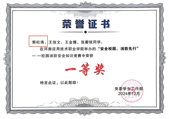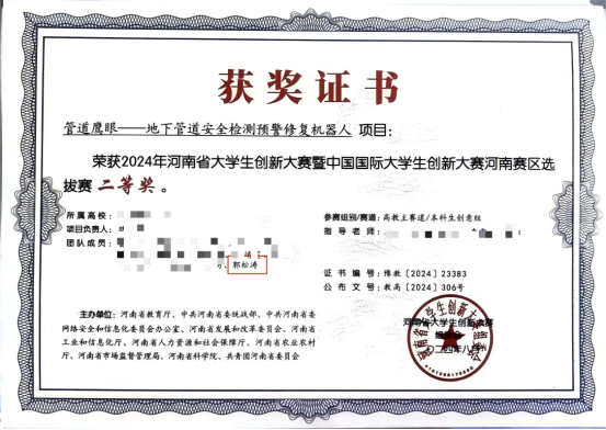 为了让知识真正“活”起来,他主动拓展学习边界。课余时间,他大量查阅专业前沿文献,了解行业最新动态;积极参与专业技能实训项目,把课堂上学到的理论努力应用于实践中。2024年,中国国际大学生创新创业大赛的消息传来,他牵头组建团队。从确定“管道鹰眼”项目选题,到深入市场调研用户需求,再到反复打磨方案细节,他和团队成员常常一干就是一整天。最终,项目斩获河南赛区省级二等奖,同时他也积累了经验,在2025年,负责的“刀医生”项目获得河南赛区省级一等奖。此外,他还成功申请并获得国家计算机软件著作权登记证书。凭借着他的努力,文化课成绩与量化成绩也始终稳居班级第一。同时,校园内的竞赛,他也踊跃报名,获得校级、院级奖项,数十余项。