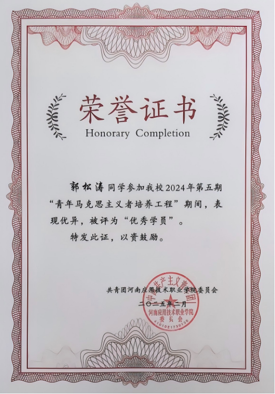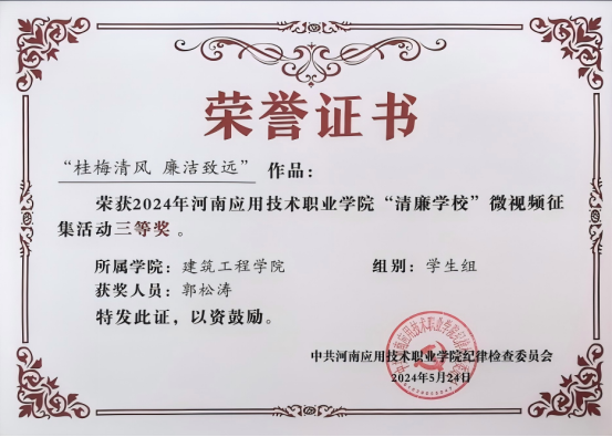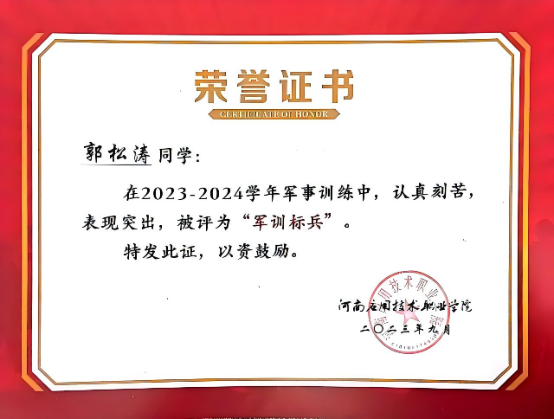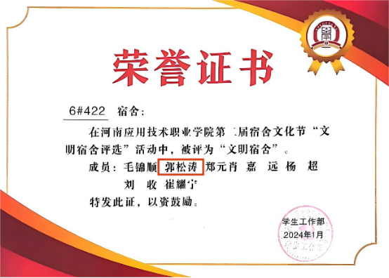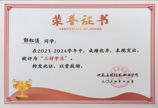 郭松涛,男,汉族,2003年10月生,河南洛阳人,中共预备党员。智能建造与设计学院建设工程管理2301班学生,辅导员黄梦娜。在校期间,荣获国家励志奖学金、国家版权局计算机软件著作权登记证书、河南省三好学生、2025年中国国际大学生创新创业大赛省级一等奖、2024年中国国际大学生创新创业大赛省级二等奖以及校级、院级奖项若干。
