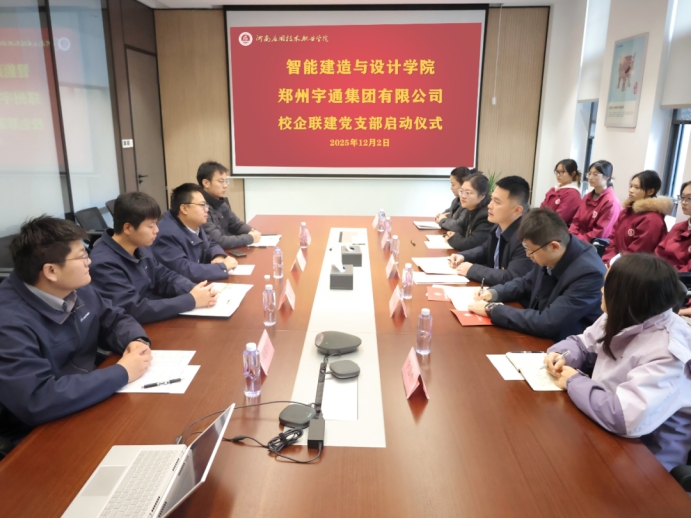 智能建造与设计学院党总支与郑州宇通集团职能党支部在宇通集团党建活动室开展座谈。宁卫广介绍了集团党组织建设情况、党建与业务融合机制以及人才培养体系,讲解了集团在校企合作方面的成功经验与典型模式,表达了和智能建造与设计学院学工党支部开展组织共建、活动共办、人才共育,以高质量党建引领高效能治理的意愿。